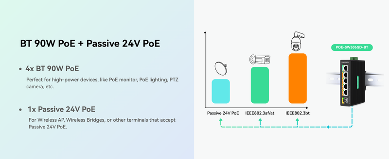 - 5 Ports Full Gigabit PoE Switch - with 4 BT90W PoE++ ports and 1 passive PoE port, compliant with IEEE802.3af/at/bt standards