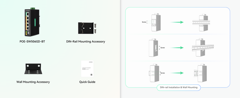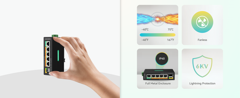 - Industrial Design - Compact IP40 rugged metal enclosure; Wide working temperature -40 ℉ to 167 ℉ (-40°C to 75°C); Support DIN-Rail & Wall Mount.