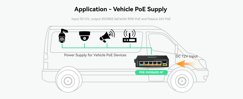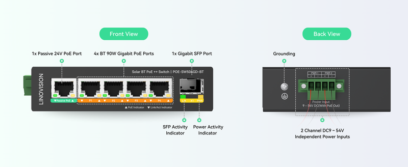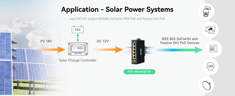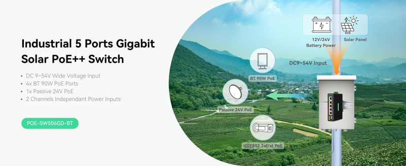 5 Ports Solar DC12V BT PoE++ Switch Support DC 9-54V input from UPS battery or solar power, output 4 BT 90W PoE++ ports and 1 passive PoE for wireless bridge or router