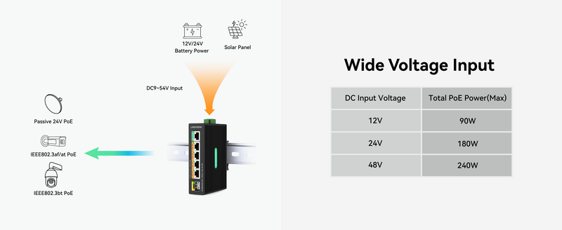 - DC 9~54V Input - Featuring built-in voltage booster, works directly with DC 12V or DC 24V Solar or UPS battery systems and output standard 48V PoE power, no extra DC-DC converter is required.