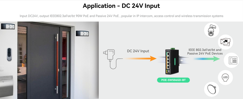 - Passive 24V PoE - To connect Wireless AP, Wireless Bridges, or other terminals that accept Passive 24V PoE. No extra PoE injector needed. PoE Pins 4/5(+), 7/8(–)