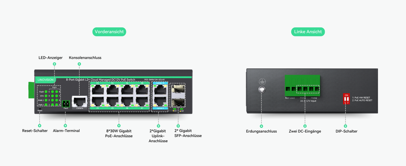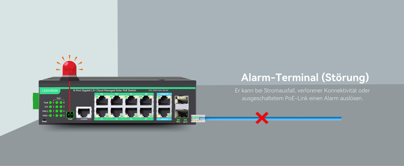 - RELAIS ALARM - Es kann ein Alarmereignis bei Stromausfall, Konnektivität verloren oder PoE-Link auslösen.