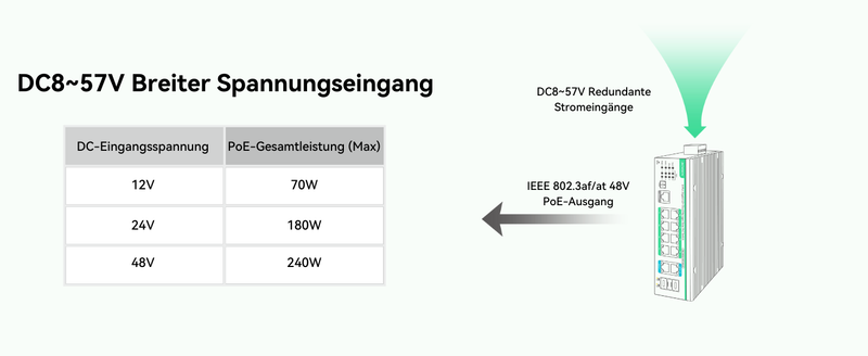- DC8~DC57V POE VOLTAGE BOOSTER - Im Gegensatz zu traditionellen PoE-Switches, die einen DC 48V-Eingang von einem AC-Netzteil benötigen, unterstützt dieser Solar PoE-Switch einen DC 8V ~ 57V-Eingang direkt von einem Solarstromsystem oder einer Batterie und bietet einen Standard IEEE802.3af/at PoE-Ausgang. Er ist sicherer und effizienter in der Energienutzung.