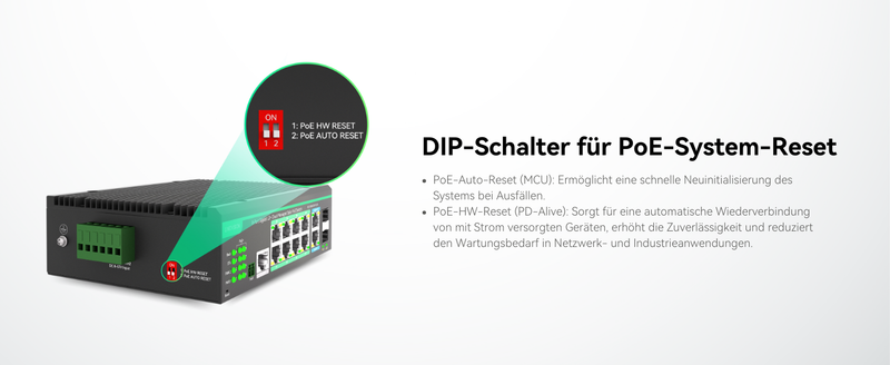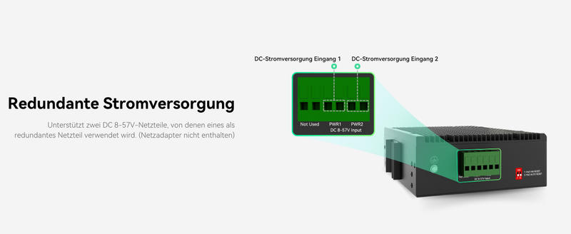 - REDUNDANTE STROMVERSORGUNG - Unterstützt 2 Kanal DC12V-48V redundante Stromeingänge und DIP-Schalter für PoE System Reset, um eine hohe Zuverlässigkeit des Netzwerks zu gewährleisten.