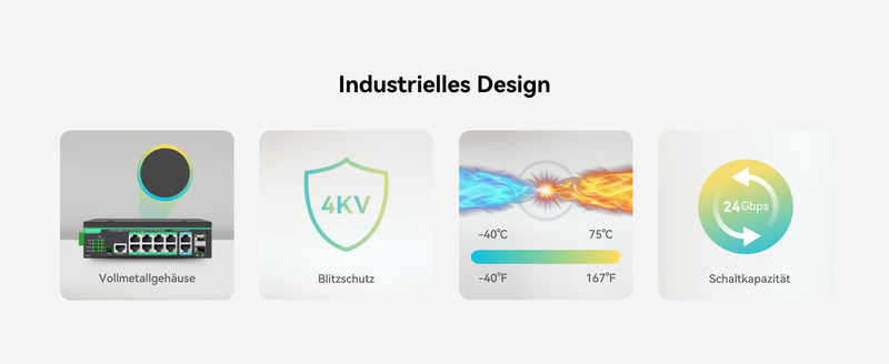 - INDUSTRIELLES DESIGN - IP40 Metallgehäuse und lüfterloses Design. Unterstützt DIN-Schiene oder Wandmontage. Breite Arbeitstemperatur -40℉ bis +167℉(-40℃ bis 75℃), 4KV Überspannungsfestigkeit und 6KV ESD-Schutz.