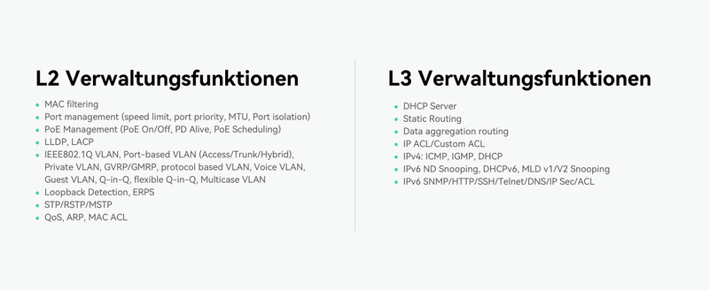 - ERPS RING - Hohe Zuverlässigkeit mit Ethernet Ring Netzwerk und höhere Bandbreite mit Static Link Aggregation und LACP