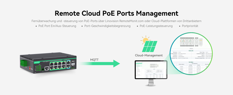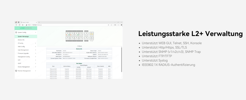 - L2+ FERNVERWALTETER PoE-SWITCH - Unterstützt L2+ Verwaltungsfunktionen wie VLAN, QoS, ACL, statisches Routing und Link Aggregation sowie die automatische Erkennung von ONVIF-Kameras. Geräteverwaltung über WEB GUI, Telnet, SSH, CLI, SNMP und MQTT Cloud (RemoteMonit Cloud)