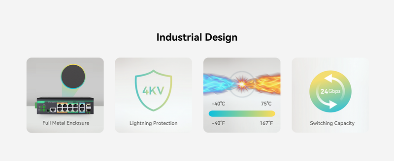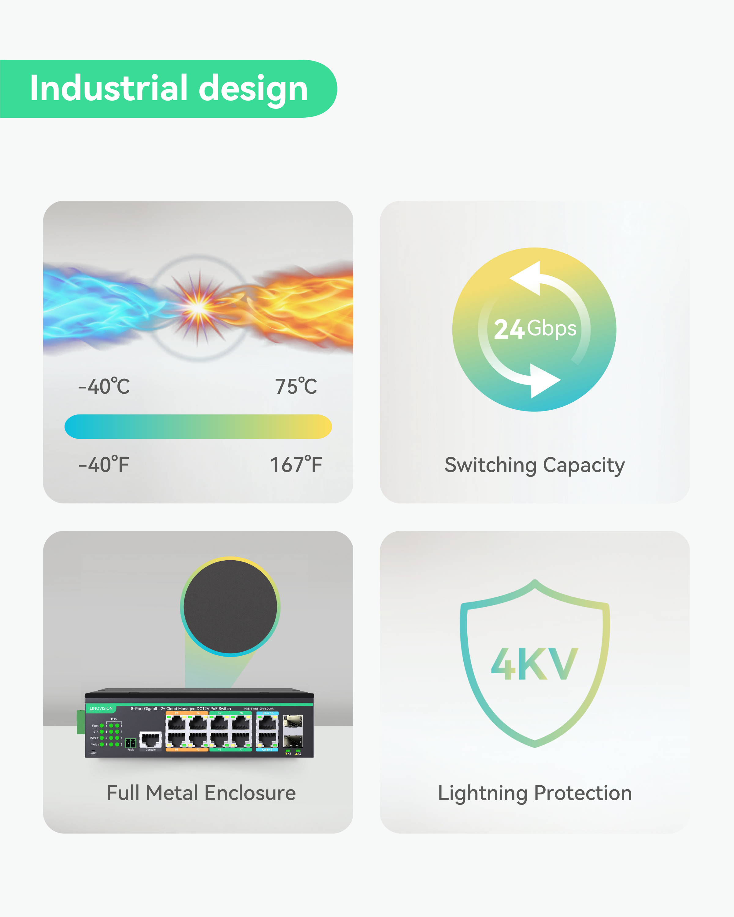 INDUSTRIAL DESIGN - IP40 Metal shell & fanless design. Support DIN-rail or wall mounted installation. Wide working temperature -40℉ to +167℉(-40℃ to 75℃), 4KV surge immunity and 6KV ESD protection.