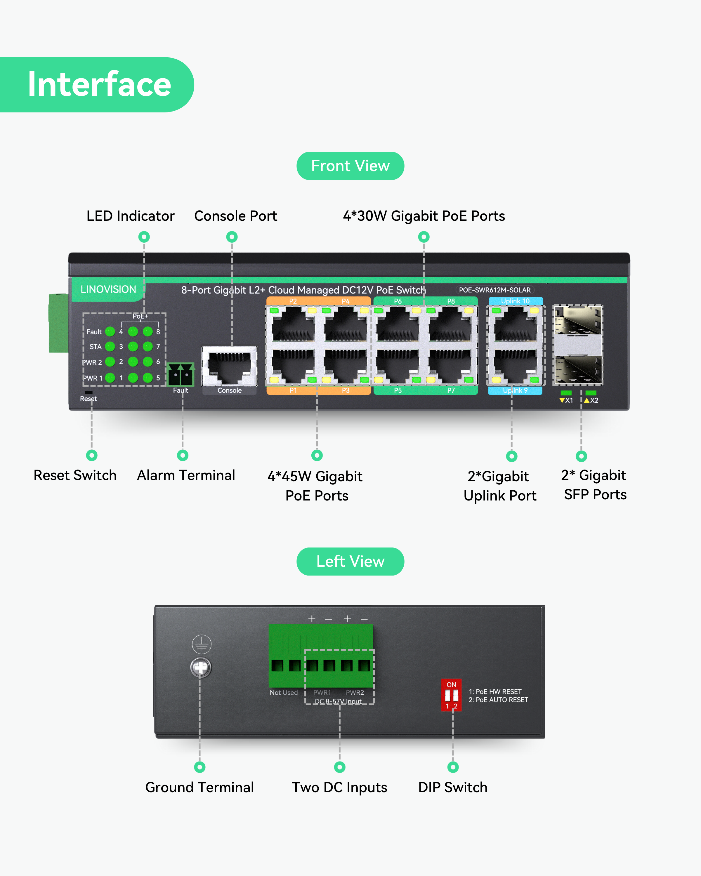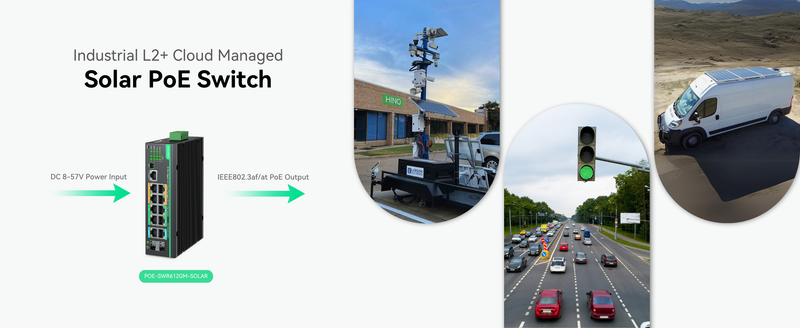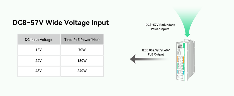 - DC8~DC57V POE VOLTAGE BOOSTER - Unlike traditional PoE Switch that requires DC 48V input from an AC power adapter, this Solar PoE Switch supports DC 8V ~ 57V input direclty from solar power system or battery and provide standard IEEE802.3af/at PoE output. It is safer and more efficient in energy use.