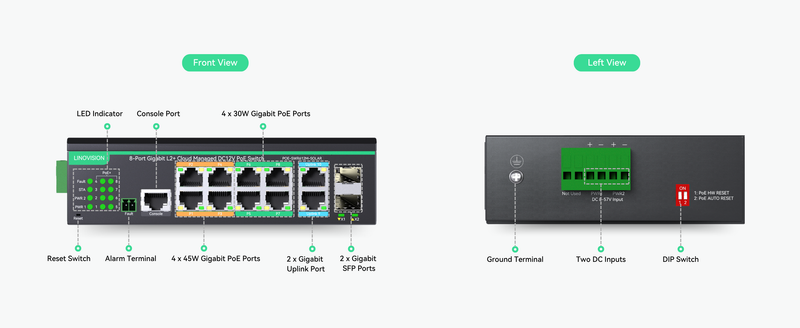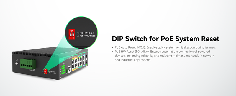 REDUNDANT POWER SUPPLY - Support 2 channel DC12V-48V redundant power inputs and DIP Switch for PoE System Reset, ensure high reliability networking system.