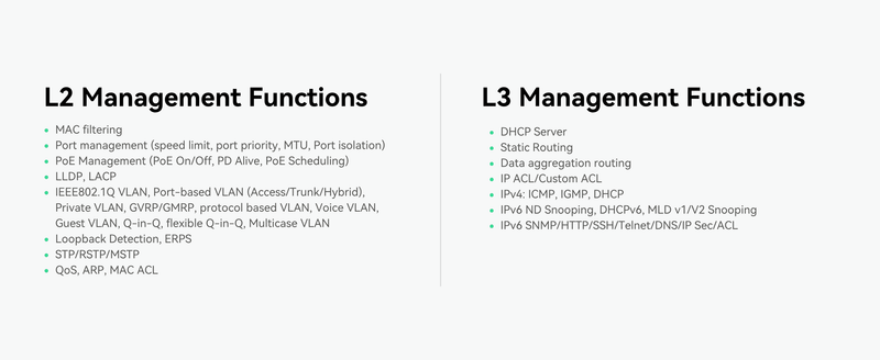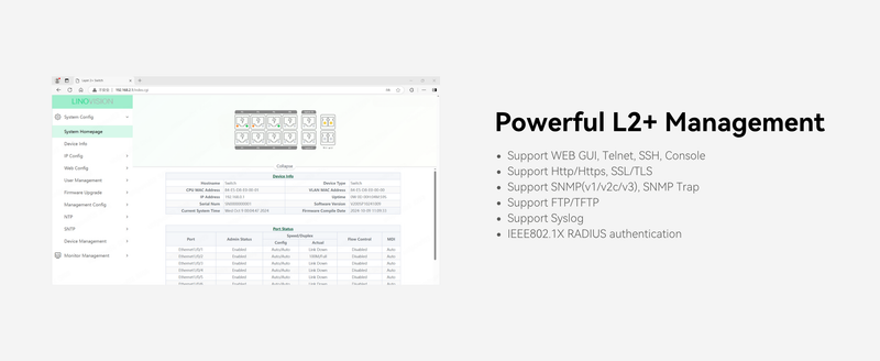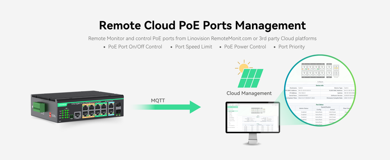 - L2+ REMOTE CLOUD MANAGED PoE SWITCH - Supports L2+ management functions like VLAN, QoS, ACL, Static Routing and Link Aggregation, as well as automatic ONVIF cameras discovery. Device management through WEB GUI, Telnet, SSH, CLI, SNMP, and MQTT Cloud (RemoteMonit Cloud)