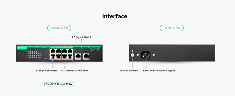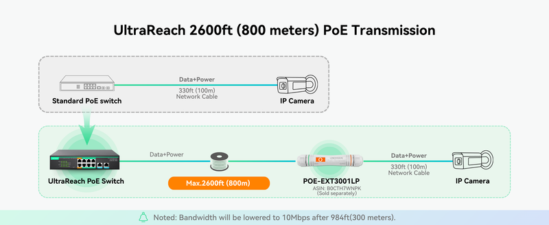 - 2600ft UltraReach PoE - All PoE ports adopts Linovision proprietary UltraReach PoE technology and extend PoE & data up to 2,600ft or 800 meters. It offers great flexibility for cabling. (POE-EXT3001LP (ASIN: B0CTH7WNPK) should be connected at the remote side and is sold separately.)