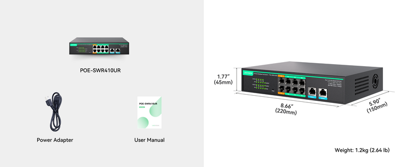 - 8 Ports UltraReach PoE Switch - Provides 8 10/100Mbps IEEE802.3af/at compliant PoE ports and 2 Gigabit ethernet uplinks.