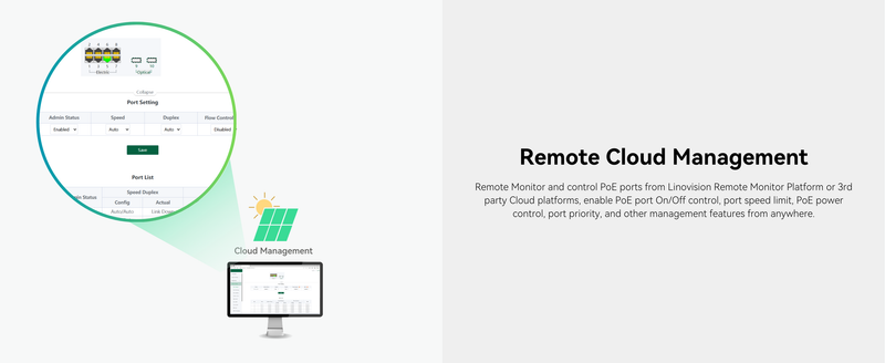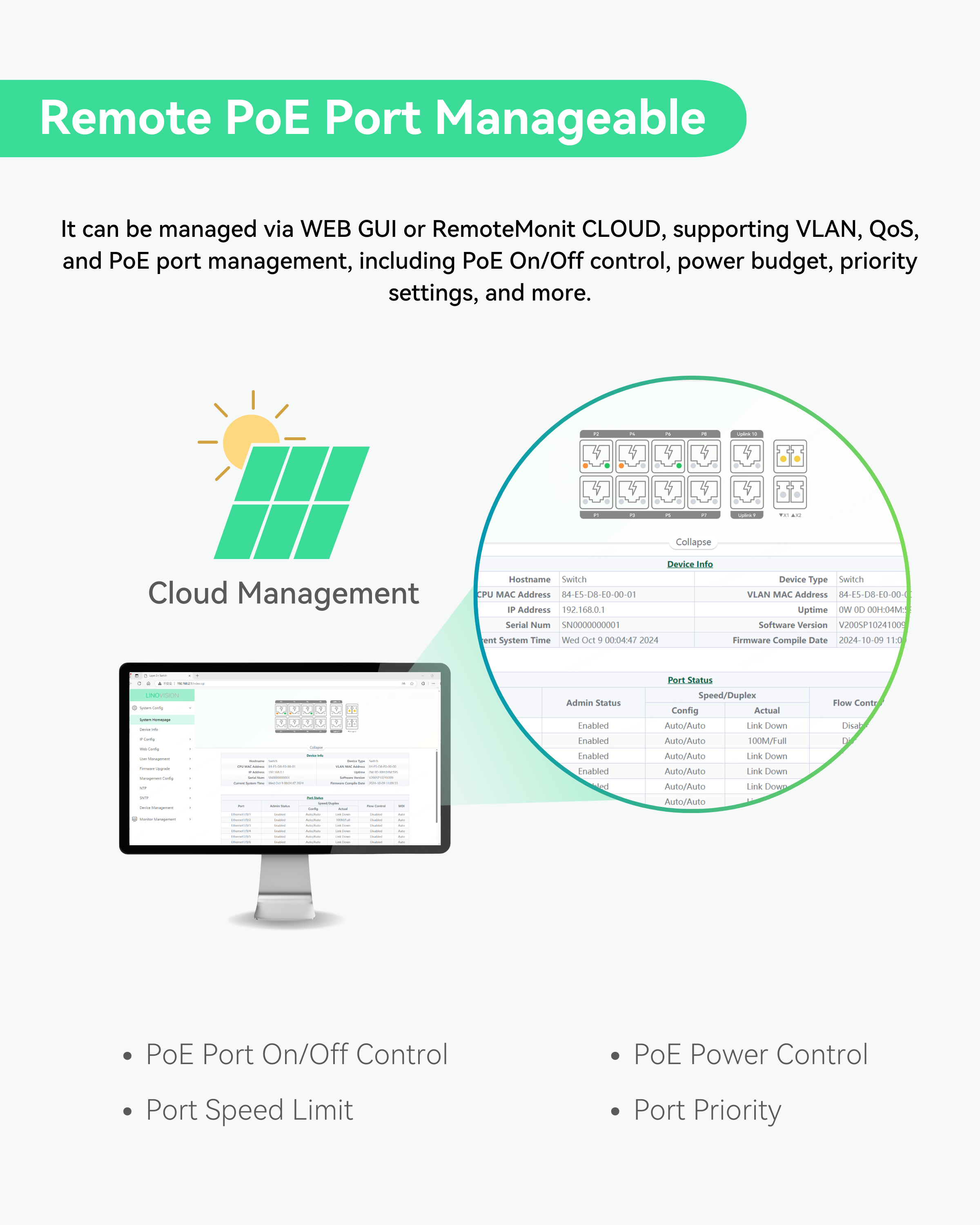 - Remotely Cloud Managed - via WEB GUI or RemoteMonit CLOUD. It supports VLAN, QOS and PoE port management, including PoE On/Off control, Power budget, priority, etc.
