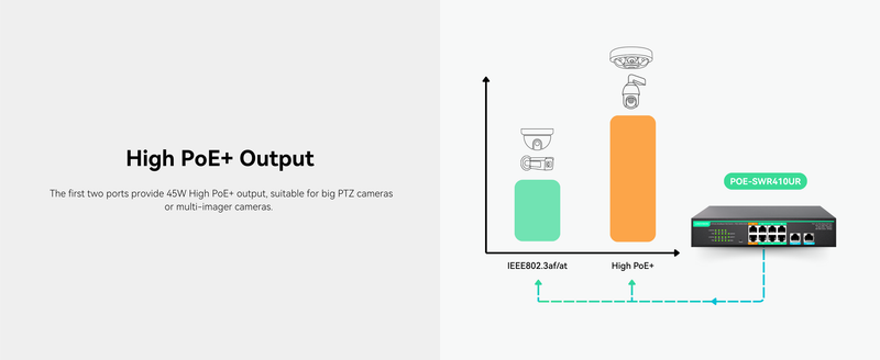 - High PoE+ Output - The first two ports provide 45W High PoE+ output, suitable for big PTZ cameras or multi-imager cameras.