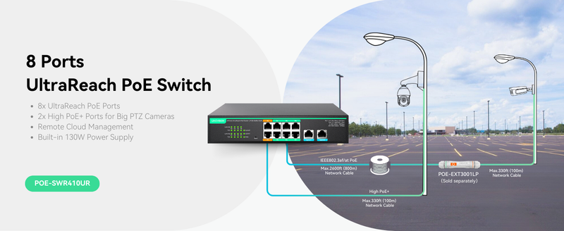 (POE-SWR410UR) 8 Ports UltraReach PoE Switch with Remotely Cloud Management, Long Range PoE and data transmisison Up to 2600ft, 2 Gigabit Uplinks and 2 High PoE+ ports for big PTZ cameras