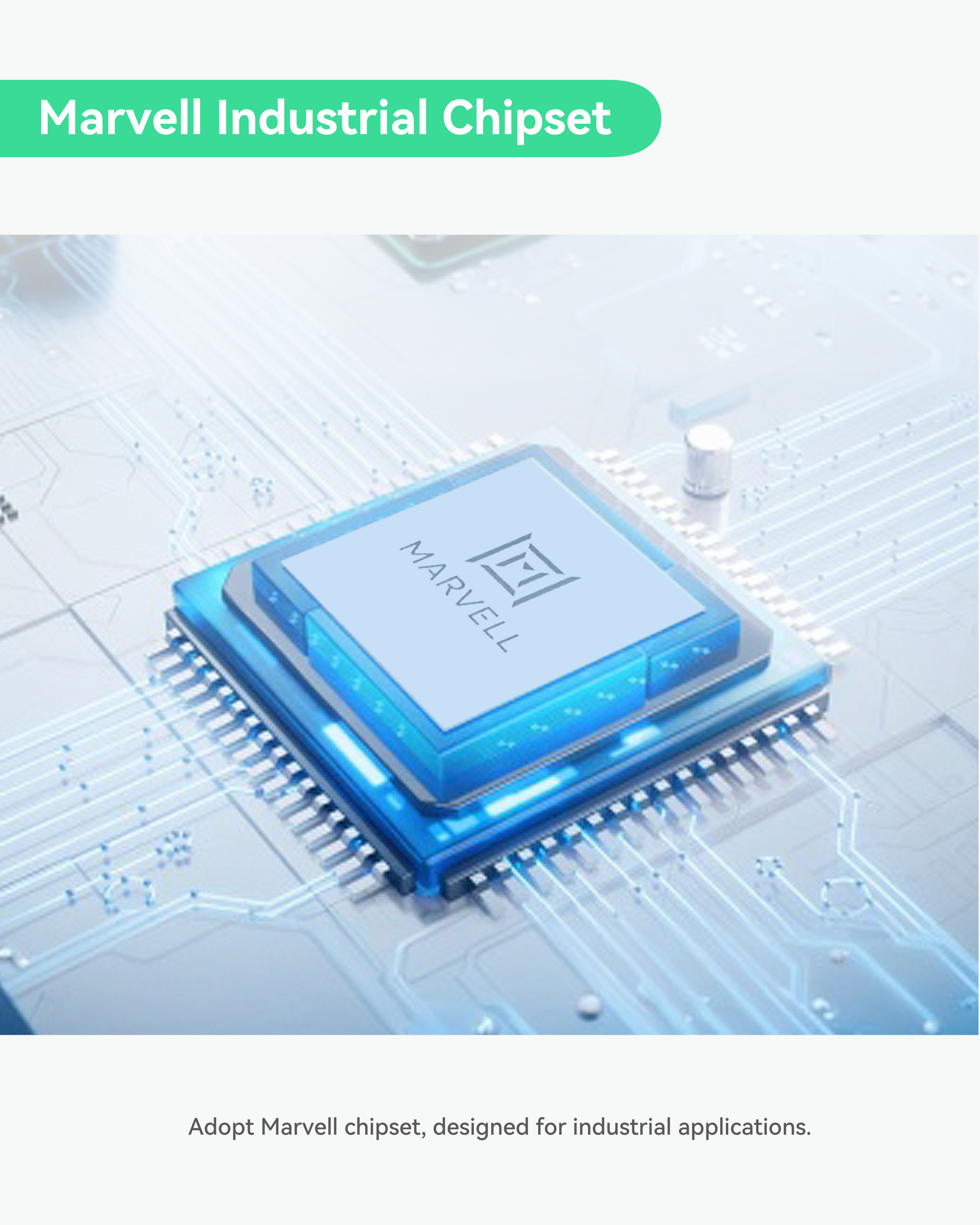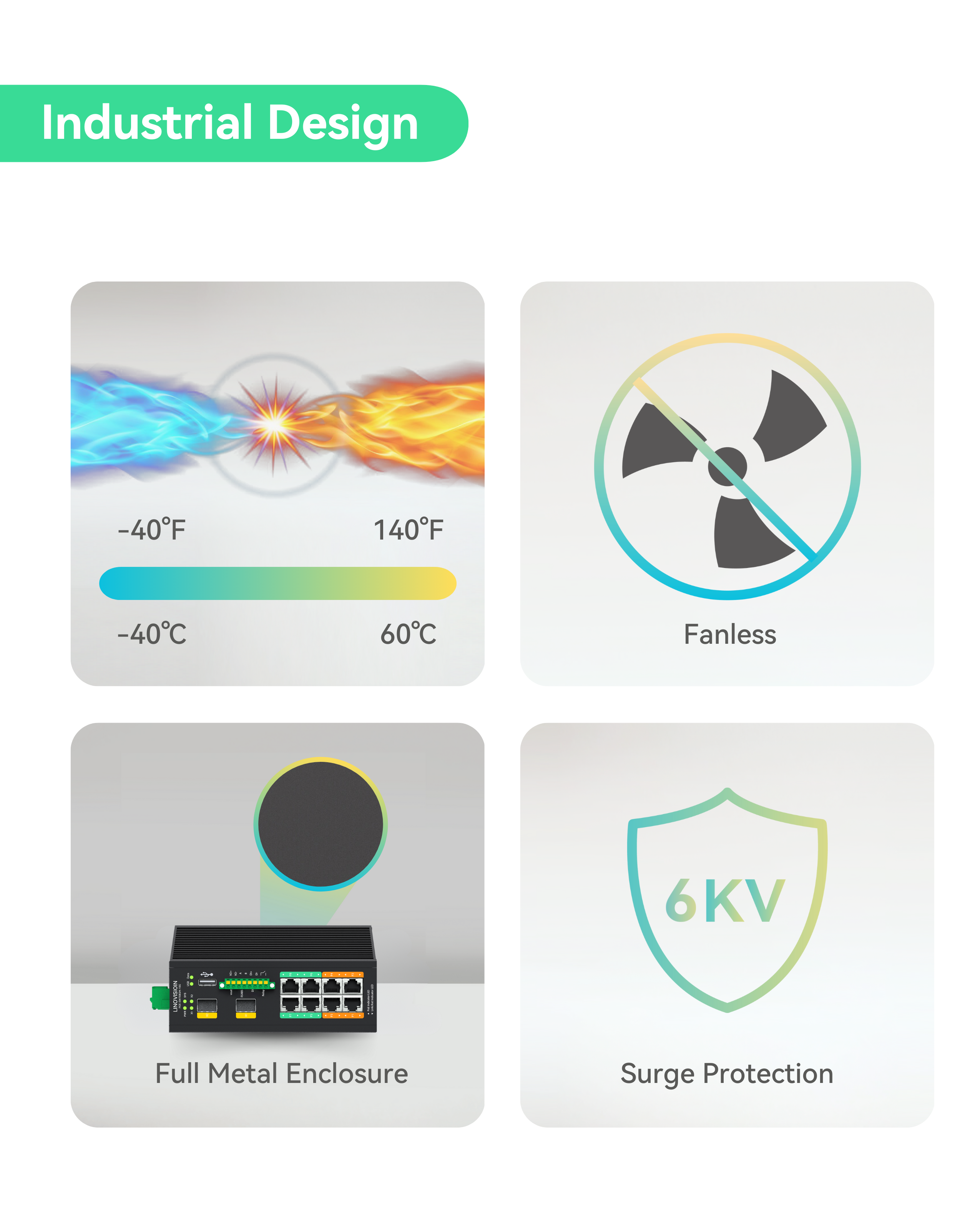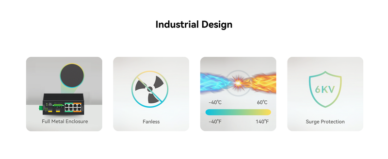 Industrial Design with Marvell Chipset - Support redundant DC power input, 12–57V DC (Ethernet Switch Only) or 44–57V DC (PoE),; Fanless metal housing supports -40°C to +60°C operation for harsh indoor environments like factory and control cabinets.