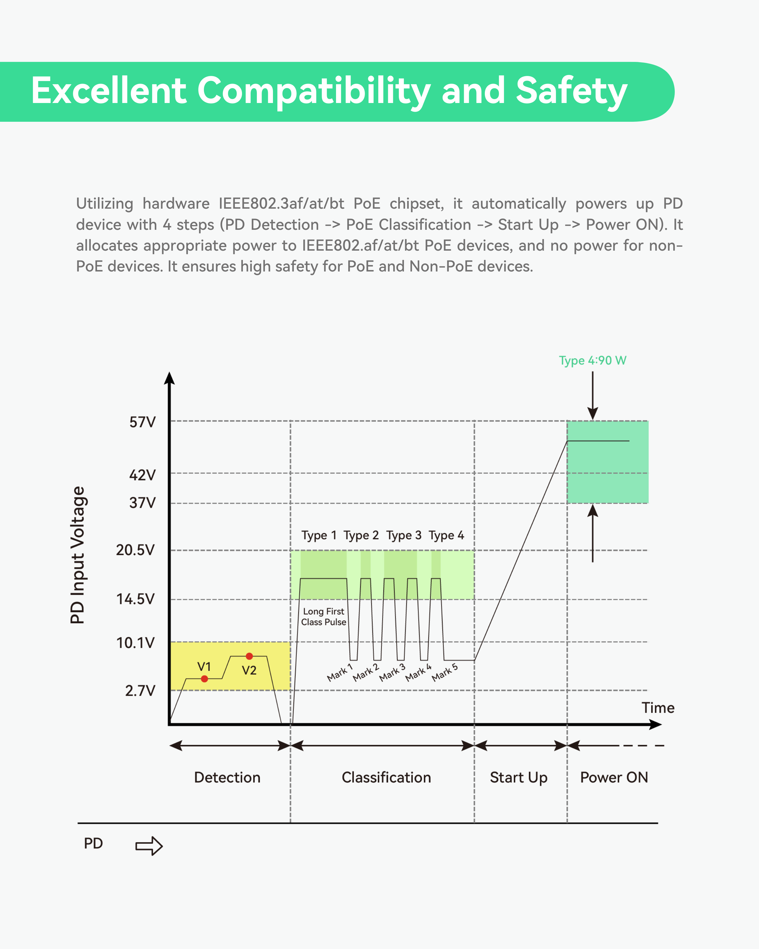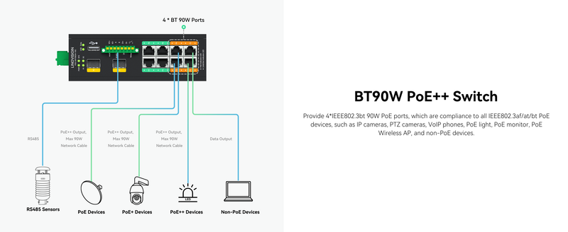 BT 90W PoE++ Output - Port 1-4 are compliant with IEEE802.3bt and output max 90W power, which is great for big PTZ cameras, PoE lighting and industrial terminals. The total PoE budget of this switch is 480W.