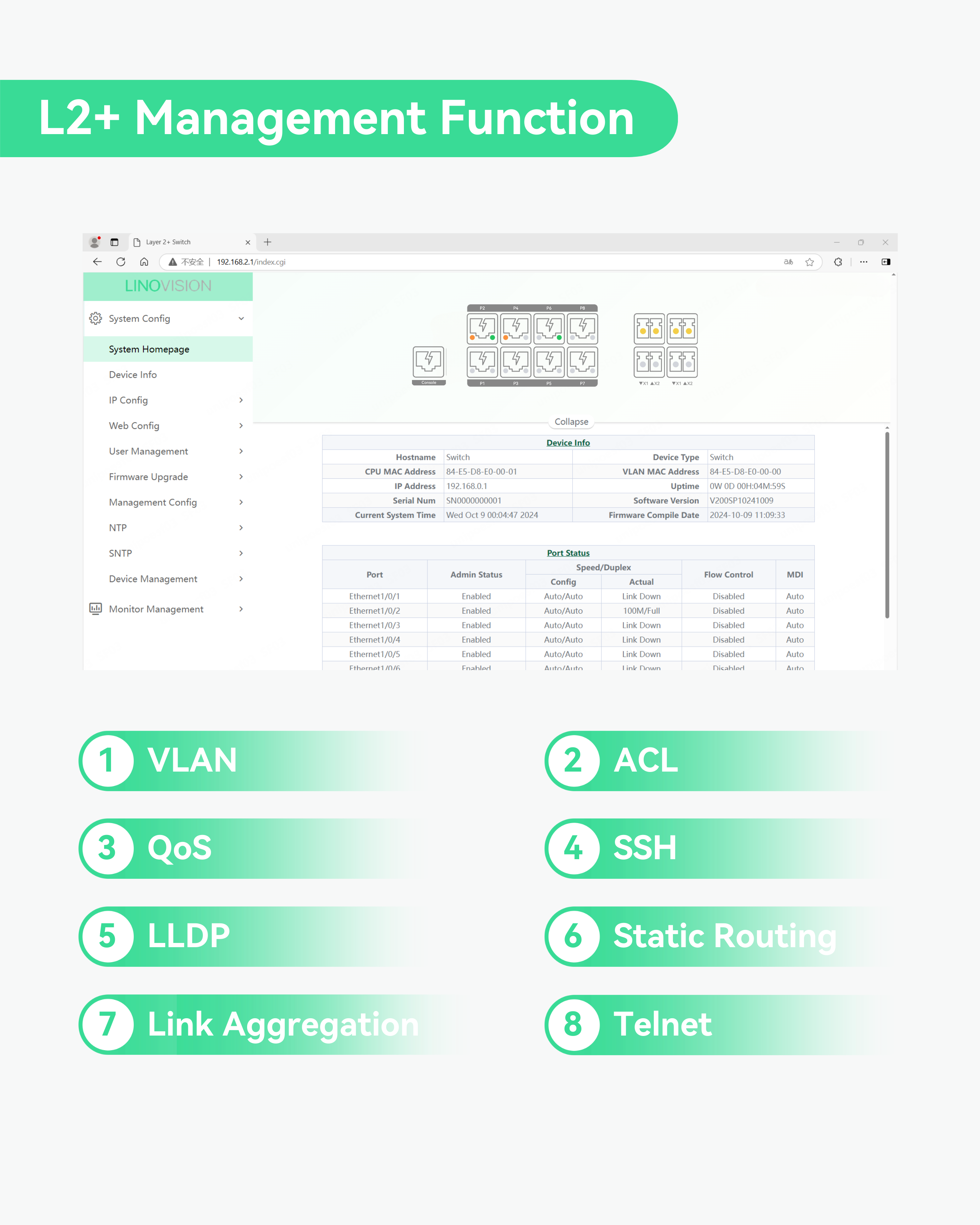 L2+ Management - Supports VLAN, QoS, IGMP Snooping, STP/RSTP, ERPS, port mirroring, static routing, and PoE watchdog. Easy management via Web GUI, CLI, Telnet, and SNMP for efficient network control.
