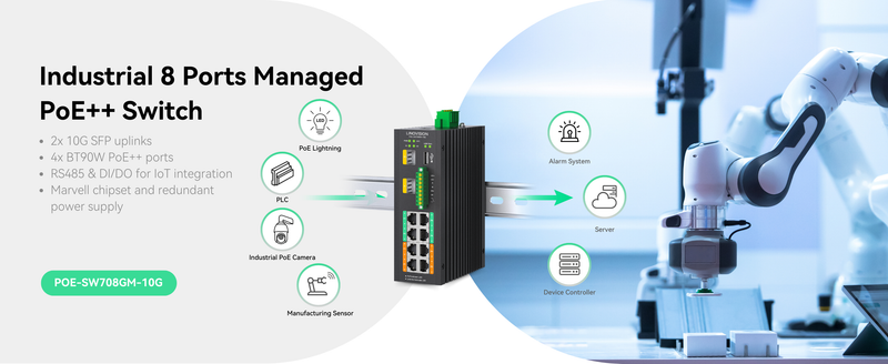 (POE-SW708GM-10G)Industrial 8-Port Managed PoE++ Switch with 2x 10G SFP Uplinks and RS485 for Industrial Automation