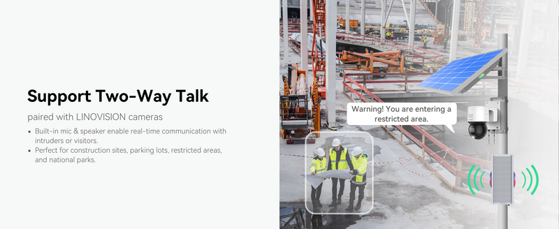 This outdoor loud speaker is a great accessory for our GO SOLO and GO BOX series solar powered cameras systems. When bundled with our cameras, it supports two way talk and customized audio warning based on Ai smart human/vehicle filtering. It is very useful in national parks, entrance gate, parking lots, etc.